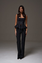 Брюки-шаровары из эко-кожи свободного силуэта, зауженные к низу, на притачном отсроченном поясе со вставленной в него резинкой. Полочка с карманом в рельефе. По переду и спинке фигурные рельефы.