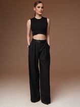 Брюки из трикотажного полотна с велюровым эффектом прямого силуэта на цельнокроеном отстроченном поясе со вставленной в него резинкой и декоративным шнурком. По бокам отрезной бочок с кантом и карманом в шве притачивания бочка.