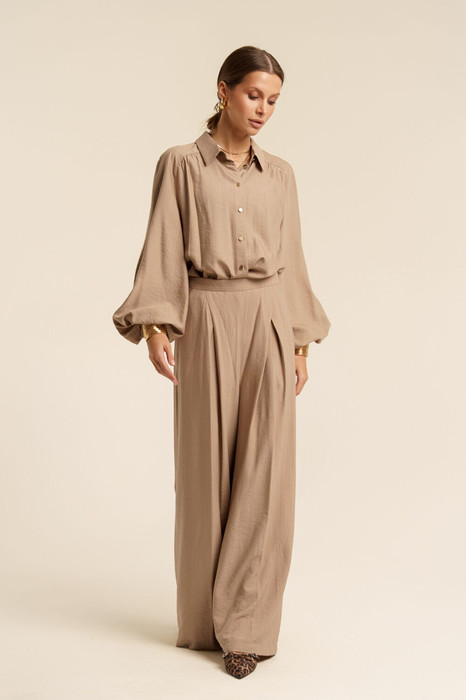 Брюки женские широкой формы из вискозной ткани с эффектом крэш. Пояс- отрезной с застежкой на потайную молнию сзади. В боковых швах имеются карманы с отрезными бочками. Сзади- имитация прорезных карманов. Спереди выполнены встречные складки. Длина по боковому шву с поясом - 113 см.