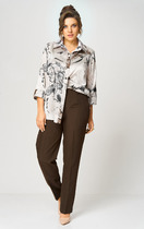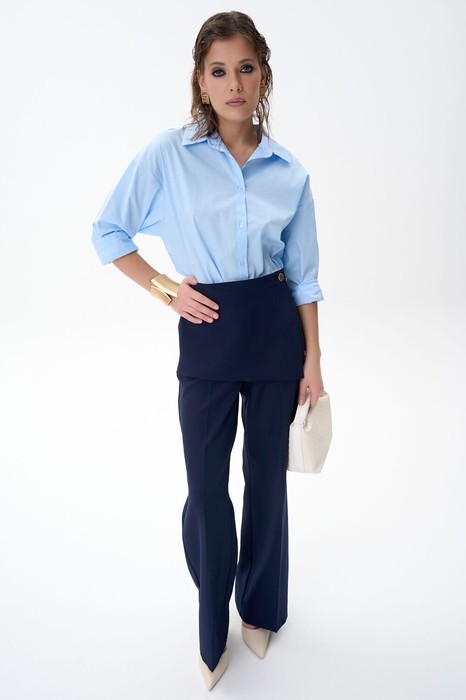 Элегантные брюки прямого силуэта с высокой посадкой и декоративной накидкой спереди. Модель сочетает в себе строгость классических брюк и эффект юбки, создавая выразительный и женственный образ.