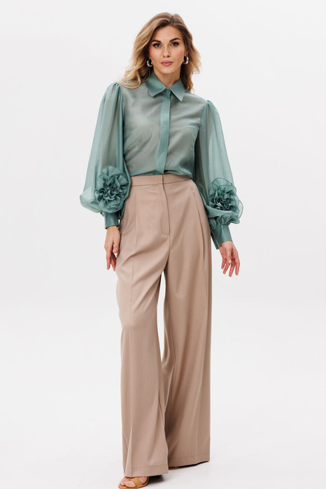 Брюки-палаццо выполнены  из костюмной ткани. Брюки на притачном поясе, длиной в пол, по бокам лампасы, складки и боковые карманы. Застежка спереди на молнию. Передняя и задняя часть брюк заутюжены на кант.
