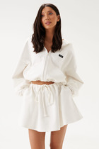 Брюки выполнены из гипюра. Брюки покроя " клеш", длиной в пол, на притачном поясе. Спереди застежка на пуговицу и молнию. По задней части пояса эластичная тесьма. По низу брюк фестоны. Брюки на отлетной по низу подкладке в виде мини-шорт из атласа.