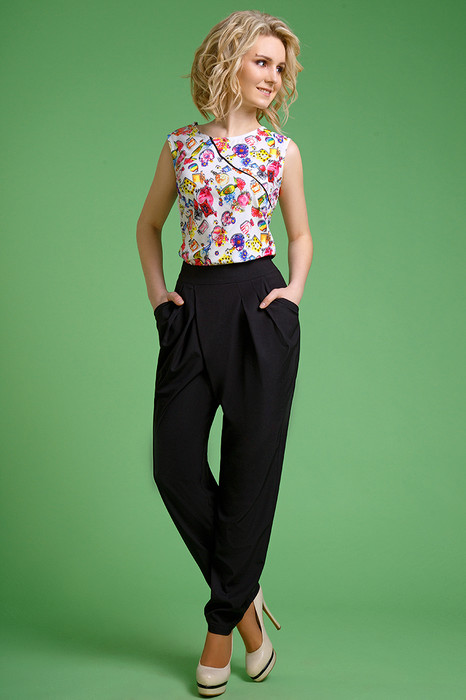 Брюки женские из легкой струящейся ткани. Асимметричного силуэта, с завышенной талией, и боковыми карманами по переду. Брюки на притачном поясе-кокетке. С застежкой молния в  боковом шве. По поясу брюк на спинке имеется металлическая декоративная пряжка.