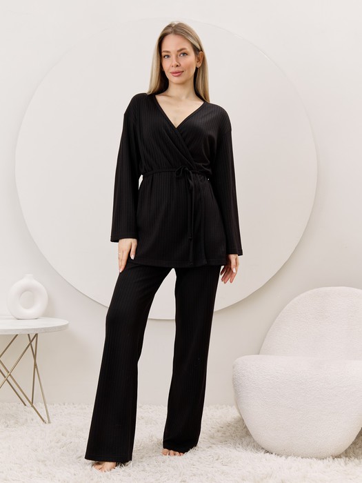 Брюки – женские из гладкокрашенного трикотажного фактурного полотна в «рубчик» с добавлением ангоры, полуприлегающего силуэта, длинные, слегка расширенные книзу, на притачном поясе с эластичной тесьмой внутри.