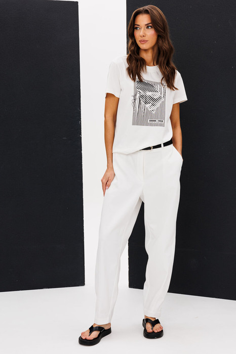 Брюки покроя "barrel", расширенные в области икры и зауженные к низу. Пояс притачной, эластичный в области спинки. По передним половинкам брюк-застежка и боковой наклонный карман. По задним-вертикальный шов. Боковой шов смещен в сторону центра передних половинок брюк. По низу-пата с регулирующими пуговицами, позволяющая создавать разную ширину брюк внизу.