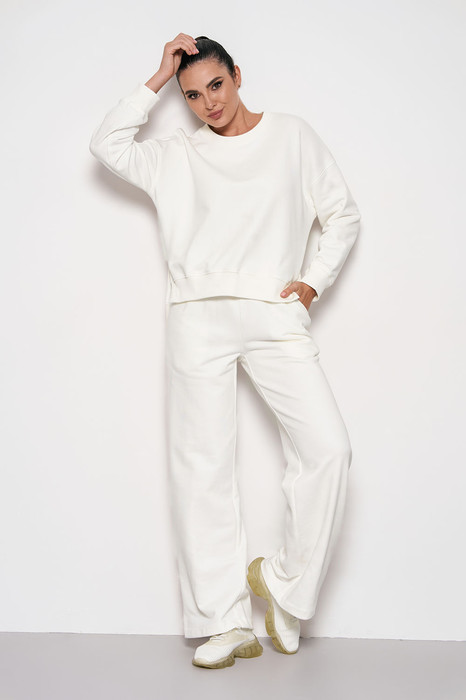 Прямые брюки (спортивные штаны) свободного силуэта с функциональными карманами в боковых швах выполнены из высококачественного футера 3-х нитки класса "пенье". Лицевая сторона ткани гладная, изнанка - петлеобразная. Пояс брюк полностью на резинке.