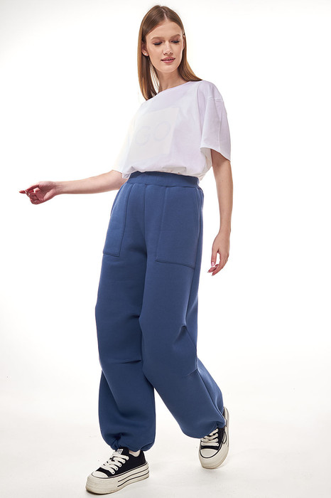 Современные комфортные брюки карго, выполнены из футера с начесом. Брюки расширенные к низу, с возможностью заузить и зафиксировать ширину внизу (низ имеет кулиску с резинкой и фиксатором). На передних половинках брюк удобные накладные карманы, складки в районе линии колен. Пояс из ткани компаньена кошкорсе со шнуром и резинкой внутри.