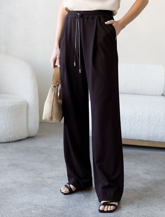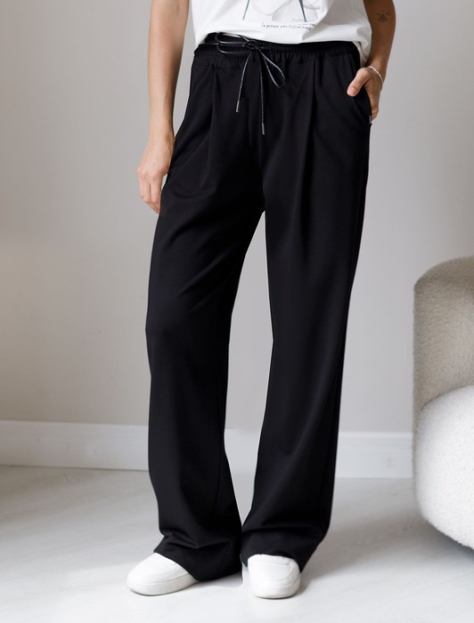 Состав: 66%Вис 25%ПА 9%ПУ Плотность: 310 Г/м2 Параметры модели на первом фото: Рост 172, бюст 88, талия 64, бедра 88Свободные брюки из трикотажного костюмного полотна. Эластичный пояс на резинке с регулируемым шнурком из эко-кожи комфортно фиксирует изделие на талии. Модель дополнена двумя боковыми и задним карманами.