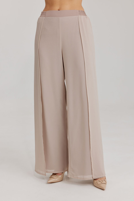 Брюки прямого силуэта, выполнены из шифоновой ткани на подкладке полной длинны. Боковой шов брюк открыт. Синка брюк заходит на перед  по верхней части. Подкладка из не просвещающейся креповой ткани. Верх брюк обработан отрезным поясом. Центральная часть пояса без резинки, остальной пояс на резинке. Низ брюк обработан швом « в подгибку».