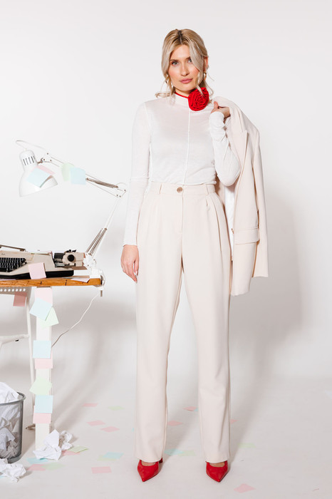 Базовые брюки с посадкой на талии и складками, которые визуально вытягивают силуэт, можно носить не только с туниками и толстовкам, но и с рубашками и укороченными моделями. Мы выбрали для них плотную ткань на основе вискозы — такой материал благодаря добавлению искусственных волокон  держит форму и отлично дышит.