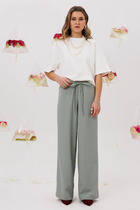 Базовые брюки с посадкой на талии и складками, которые визуально вытягивают силуэт, можно носить не только с туниками и толстовкам, но и с рубашками и укороченными моделями. Мы выбрали для них плотную ткань на основе вискозы — такой материал благодаря добавлению искусственных волокон  держит форму и отлично дышит.