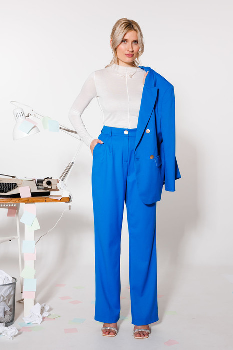 Базовые брюки с посадкой на талии и складками, которые визуально вытягивают силуэт, можно носить не только с туниками и толстовкам, но и с рубашками и укороченными моделями. Мы выбрали для них плотную ткань на основе вискозы — такой материал благодаря добавлению искусственных волокон держит форму и отлично дышит.