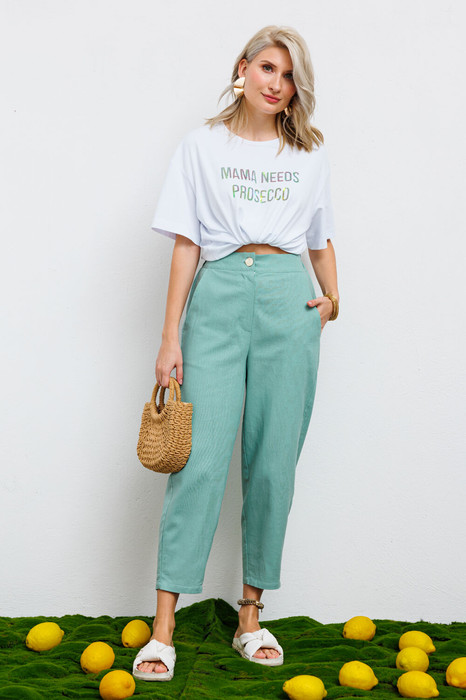 Брюки длиной «по косточку» легко впишутся в гардероб и останутся в нем на много сезонов. Пояс с резинкой для идеальной посадки по талии. Сзади расположены накладные карманы с клапаном. Длина - 95 см.