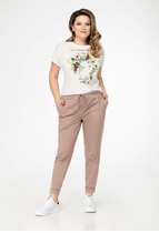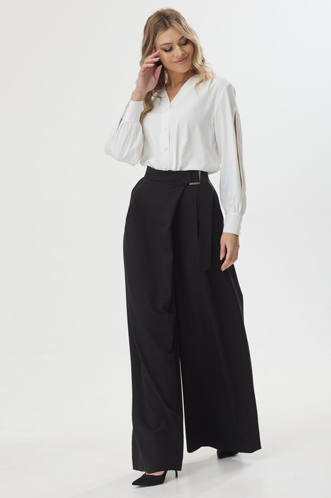 Стильные брюки на запах, расклешенные книзу из костюмной ткани. По верху брюки на притачном поясе с центральной застежкой на молнию. Правая брючина формирует запах с застежкой на полукольца. В боковых швах карманы. На задних половинках брюк декоративные листочки.