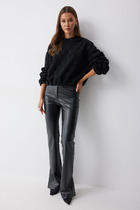 Брюки прилегающего силуэта расширенные книзу  из экокожи. По верху притачной пояс с застежкой на петлю и пуговицу. На передних половинках обработана застежка молния в среднем шве. По низу брюк в боковом шве шлица.Обращаем ваше внимание, что фурнитура может отличаться от фото.