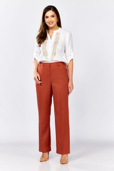 Брюки женские классические. Спереди застёжка на молнию и пуговицу.Сзади вытачки. В боковых швах карманы с отрезным бочком.Пояс по спинке на резинке , дополнен шлёвками.