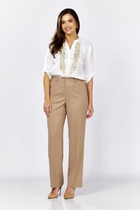 Классические брюки - это всегда актуальный и универсальный выбор.Брюки прямые, с высокой посадкой, с заутюженными стрелками. Верхний срез брюк с притачным поясом.  Брюки с застежкой на тесьму-молнию в среднем шве передних частей и застежкой на петлю-пуговицу по выступающим концам пояса. Передние части брюк с мягкими складками от верхнего среза, боковыми карманами, наклоненными к боковому шву. Брюки создают женственный дуэт с жакетом (арт. 2894) из капсулы.