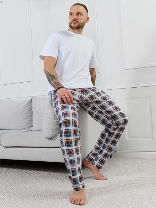 Брюки мужские из трикотажного полотна "кулирка" в клетку, свободного покроя, на притачном поясе с эластичной тесьмой внутри, с карманами в боковых швах. Нижние срезы обработаны подгибкой.