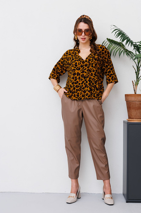 Брюки с притачным поясом, горизонтальным рассечением в области колена и с карманами в боковых швах.