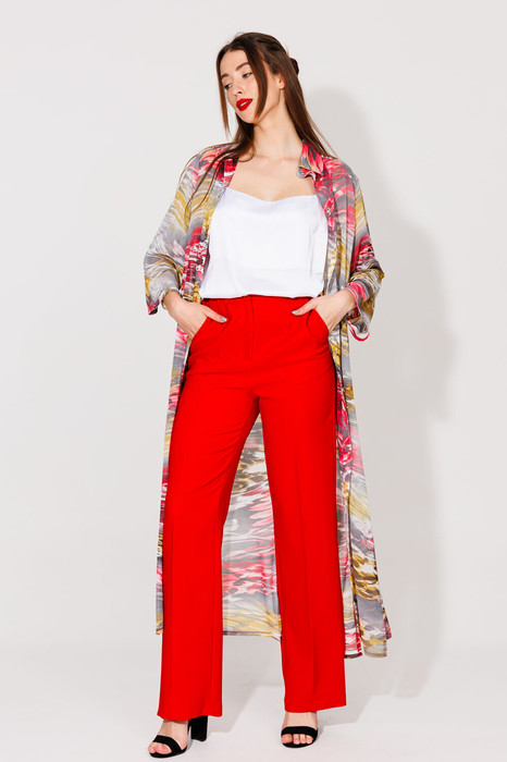 Брюки прямого кроя, с карманами.По переду боковой карман, застежка на тесьму-молнию и пуговицу. По спинке верхний срез представлен резинкой.