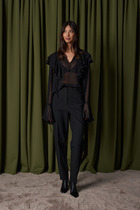 Брюки с притачным поясом, горизонтальным рассечением в области колена и с карманами в боковых швах.