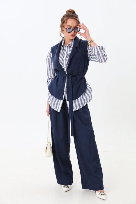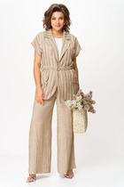Элегантные брюки прямого кроя с боковыми карманами с отрезным бочком. Застежка на молнию и пуговицу. По переду - складки. Задние половинки с талиевыми вытачками и прорезными карманами с листочкой. Верхний срез обработан притачным поясом, по спинке собран на резинку. Низ обработан швом в подгибку.
