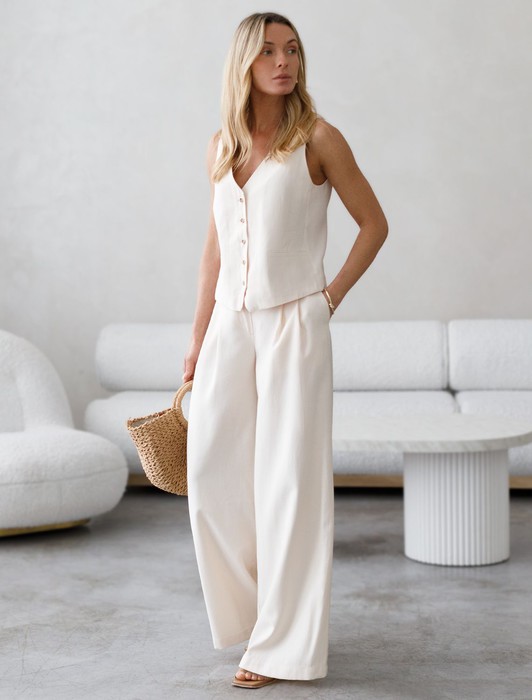 Состав: 70%Лиоцелл (Вис) 30%ПЭ Параметры модели на первом фото: Рост 172, бюст 88, талия 64, бедра 88Брюки выполнены из плотного лиоцелла. Модель дополнена карманами и высоким поясом на пуговицах. Ткань изделия отлично держит форму, плавно драпируется и не просвечивает. В теплое время года приятно охлаждает кожу. Добавление синтетических волокон в составе изделия, предотвращает сминаемостьи поддерживает формоустойчивость. Брюки сочетаются в костюме с топом D23.063 и блузкой D29.266, D29.267 и жилетом D27.002