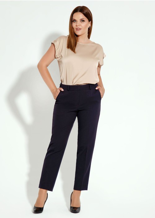 Брюки укороченной длины, по бокам по низу имеются небольшие разрезы. Брюки на талии на поясе, по спинке по поясу имеется резинка. По переду по бокам карманы. Застежка на молнию по переду и потайные крючки по поясу.
