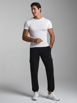 Брюки мужские, ткань с рисунком камуфляж. Брюки на манжетах, с карманами без молний. Сзади внизу брюк принт в виде геометрического рисунка. Под карманами принт - надписи