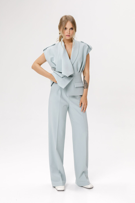 Детали: высокая посадка, притачной пояс со шлевками, передние половины с небольшими застроченными мягкими складками и заутюженными стрелками, застежка на молнию и пуговицу, боковые карманы. Задние части брюк с вытачками и заутюженными стрелками. Пояс брюк прямой, без резинки.
