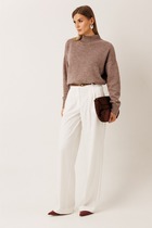 Модель прямого силуэта, на подкройном поясе, со шлёвками. Пояс частично собран на резину. Застёжка на молнию, потайную пуговицу и крючки на поясе. Спереди карманы в подрезных бочках. Сзади прорезной карман в рамку с клапаном. Ремень в комплект не входит.