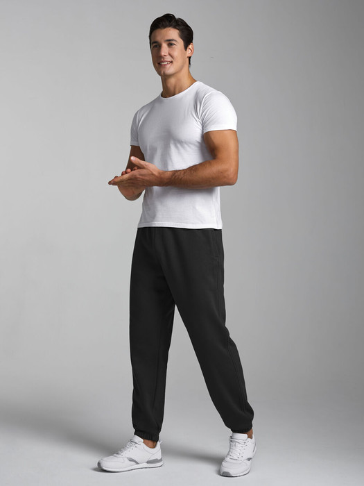 Брюки мужские "Джоггеры" из плотного хлопкового трикотажного полотна с петельной изнанкой. Карманы в подрезах бокового шва. Низ брюк заужен на резинку. Эластичный пояс брюк дополнительно регулируется шнуром.