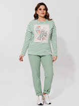 Брюки женские спортивного стиля из эластичного хлопкового полотна, прямого от бедра кроя. По передним половинкам брюк расположены фигурные карманы. По передним и задним половинкам отсрочены канты. Пояс брюк притачной с эластичной тесьмой-резинкой, в передней части пояса вставлен декоративный шнурок с металлическими наконечниками.