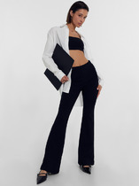Брюки прямые из костюмной ткани. Верх на поясе со шлевками. Ширинка на молнии и удлиненный пояс со скрытой застежкой на пуговицу и крючок. Складки спереди, диагональные боковые карманы и задние прорезные листочки.