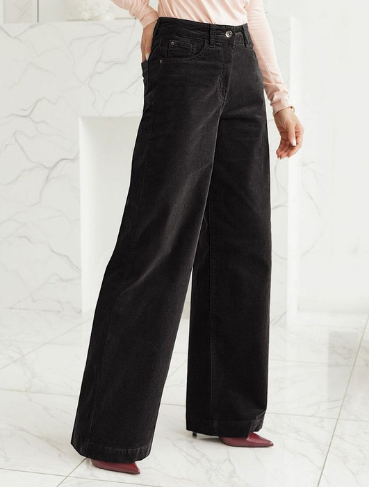 Брюки свободного кроя трубы выполнены из мягкого хлопкового микро-вельвета с добавлением эластана. Изделие комфортно садится по фигуре и не сковывает движения. Модель с пятью карманами, как у джинсов дополнена высококачественной фурнитурой с фирменным логотипом бренда. Идеально впишутся в повседневный образ, со свитером крупной вязки, курткой-косухой, ботинками на грубой подошве, челси и казаками.
