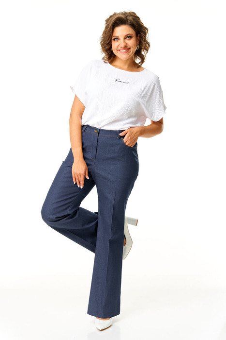 Брюки клёш от колена с центральной застёжкой на молнию и петлю-пуговицу. По передним и задним половинкам заутюжены канты. В боковых швах карманы. Задние половинки с отрезными кокетками и накладными карманами. Пояс притачной.