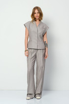 Брюки прямого силуэта из кожи с рельефами и отстрочкой по переду. По переду застежка на тесьму молнию в гульфике и пуговицу в поясе. По переду брюк наклонные карманы. Пояс притачной со вставкой эластичной тесьмы резинки в «бочках», что обеспечивает комфортную посадку на фигуру. Длина брюк по боковому шву 98 см.