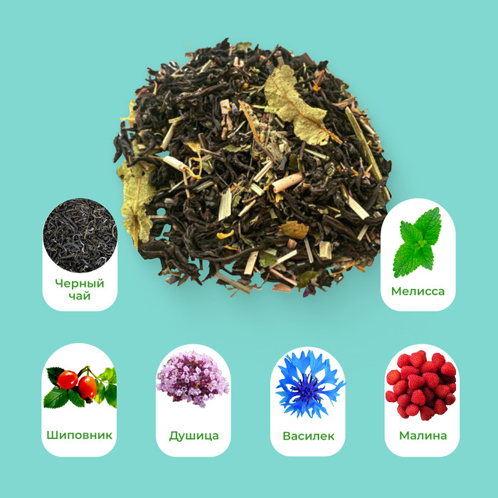 василёк лепестки, душица, малина, мелисса, чай черный, шиповник измельченные плоды