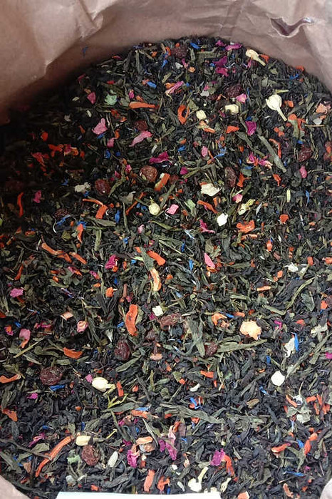Чайный купаж из крупнолистового черного и зеленого чая с цветочными лепестками и ароматными сухофруктами.