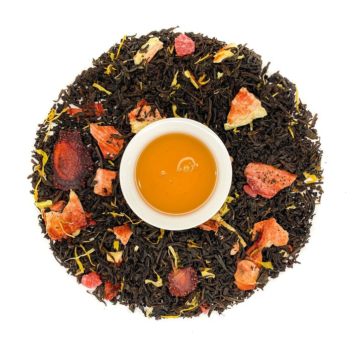 Черный чай с добавками для любителей фруктово-ягодных вкусов. Напиток удивит сбалансированным ароматом клубники и арбуза, поднимет настроение.