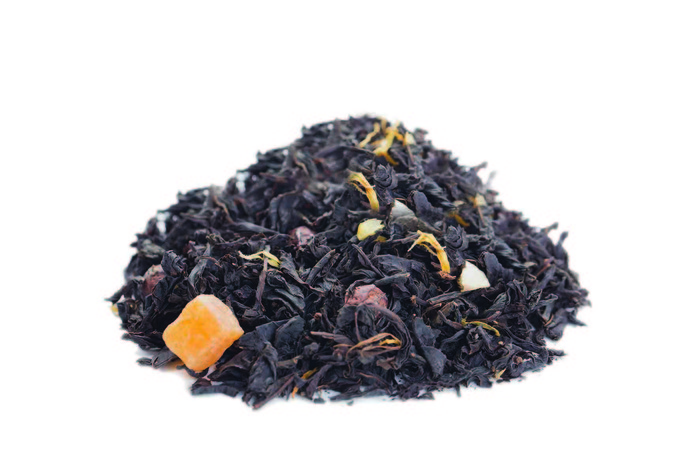 Черный крупнолистовой чай, апельсиновая корка, боярышник, цукаты ананаса, лепестки календулы с ярким апельсиновым ароматом.