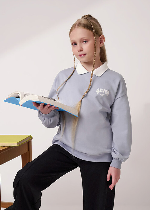 Стильный джемпер из мягкого футера в нежном голубом оттенке- то, что нужно для создания классного лука и отличного настроения! Модель с объёмными рукавами дополнена контрастным вязаным воротничком. Создавай стильные образы на каждый день и будь в тренде!