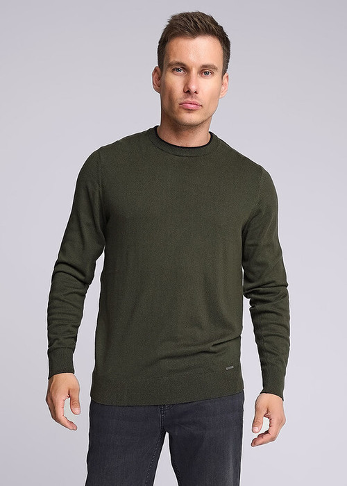 Мужской базовый вязаный джемпер с круглым вырезом горловины и длинным рукавом. Джемпер из смесовой пряжи с хлопком, дополнена интересными акцентами фирменной фурнитуры. Модель относится к базовому ассортименту, которая подойдет к любому низу.