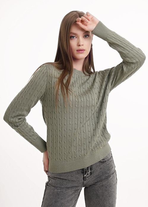 Вязаный джемпер прямого силуэта из хлопковой пряжи с добавлением акрила, переплетение ""косы"". Втачной длинный рукав. Округлая горловина с бейкой. По низу изделия и рукавов манжеты.