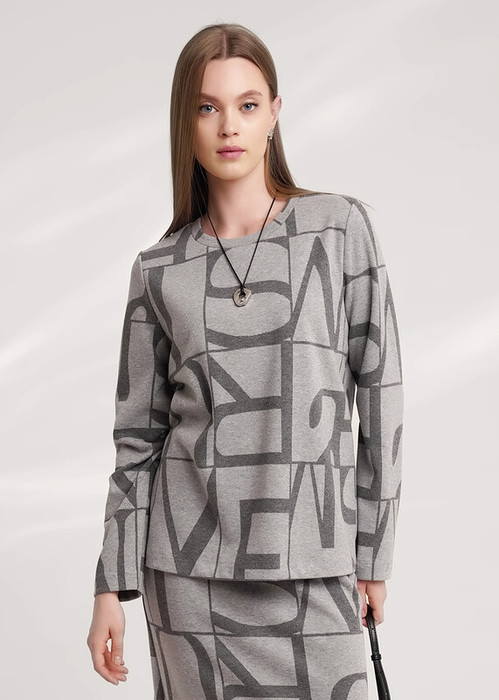 Джемпер из поливискозного трикотажного полотна джерси жаккард, умеренного объема. Длинный втачной рукав. Округлая горловина с обтачкой. По низу рукавов и изделия потайной стежок.