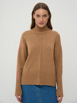 Джемпер прямого силуэта из поливискозного трикотажного полотна джерси. Спущенный длинный рукав. По горловине отложной вязаный воротник с планкой. Боковые разрезы.