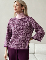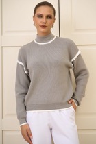 Вязаный джемпер из эластичной пряжи с вискозой в составе. Длинный втачной рукав. Квадратная форма горловины по краю декорирована контрастной черной отделкой.