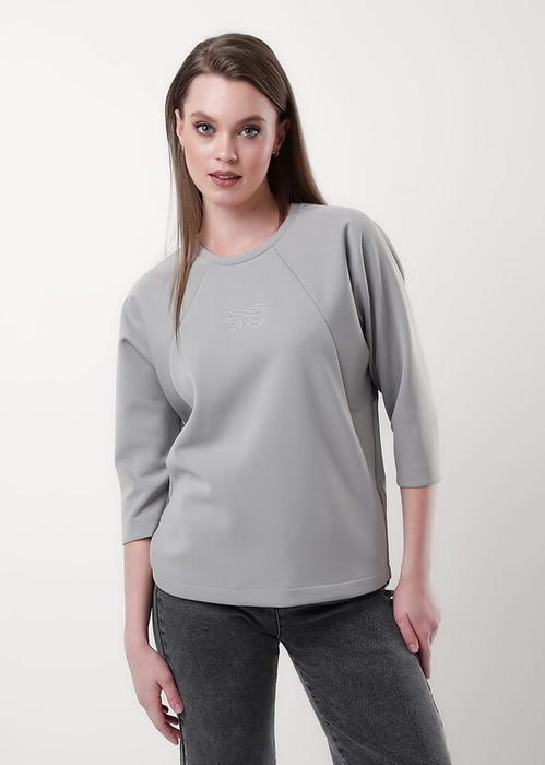 Джемпер свободного кроя из плотного, трикотажного полотна пике. Цельнокроенный рукав длиной 3/4. Округлая горловина с обтачкой. По переду декоративные резы с карманом в шве. Сзади по спинке средний шов. Спереди вышивка.