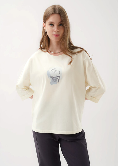 Джемпер из трикотажного полотна умеренного объема. Длинный цельнокроеный рукав по переду, по спинке рукав реглан. По низу рукава отвороты. Округлая горловина с внутренней обтачкой. По спинке средний шов. По низу изделия боковые разрезы. Спереди принт.