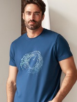 Футболка мужская с круглым вырезом горловины и коротким втачным рукавом из фактурного полотна флам. Футболку дополняет шрифтовой принт. Подойдет для прогулок и встреч с друзьями.